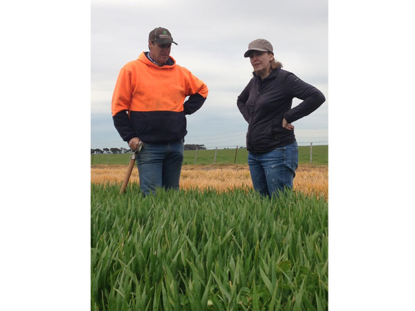 Evan Lewis, cover cropping advocate, and soil microbial ecologist Dr Helen Hayden, in Werneth, Victoria.