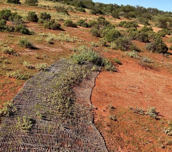 Collaboration between Rangelands NRM, Bush Heritage Australia and First Nations Rangers has involved working on country at Hamelin Station to assess sites of concern and do on-ground works to halt active erosion and prevent mobilized sediment from moving downstream (erosion matting and sieve rolls laid in active gully areas and sand plumes to block movement) to protect ancient stromatolites and seagrass beds at Hamelin Pool.