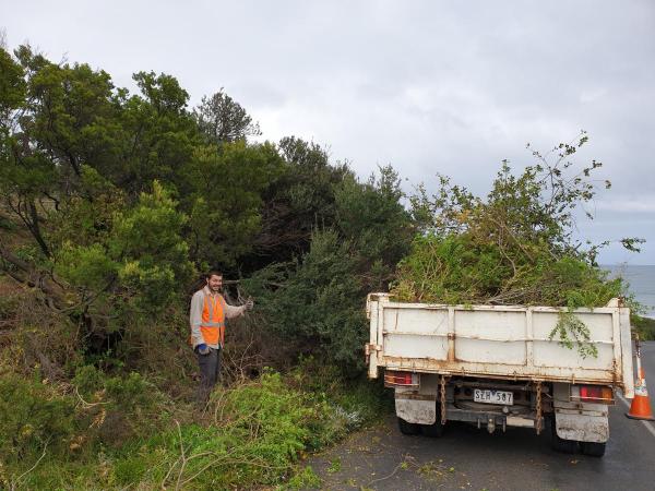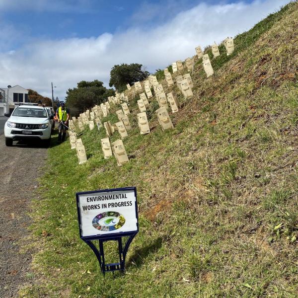 Weed control at the project site was a major aspect and challenge. Steep, uneven ground proved difficult working alongside Presidents Avenue. A major initiative was the Traffic Control supplied by the City of Greater Geelong to allow access along the road. Barwon Coast COM provided the truck to remove the woody weeds from the site. Importantly not only did this improve the biodiversity, but also Barwon Coast removed 16.5m3 of weed / fuel loads.