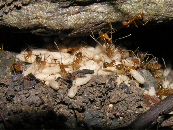 Aggressive, acid-spitting yellow crazy ants typically attack earthworms, lizards, skinks, frogs, bird nests and any accessible sources of protein, and have been known to enter towns and homes in search of food. If left unchecked they can form super colonies that can strip fruit trees and crops, and destroy rainforest ecosystems, advancing hundreds of metres each year.