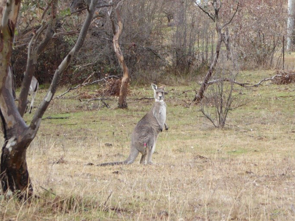 A collared kangaroo that has just been darted with GonaCon. After a few minutes the dart falls out and can be recovered. Photo: Lyn Hinds.
