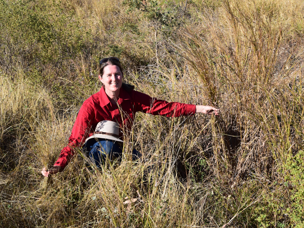 Nicole Spiegel comparing the above ground biomass of exotic Indian couch (small tufted grass) with native black speargrass (large, tussock grass).